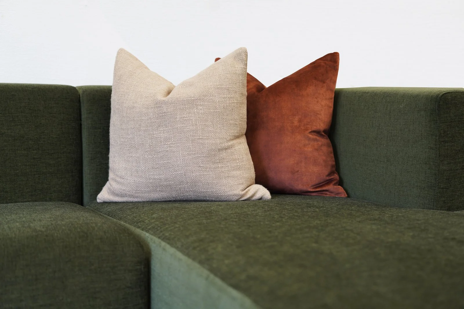 The MADRID SOFA is a sleek, minimalist sectional sofa in dark mossy green fabric with a low-profile design.